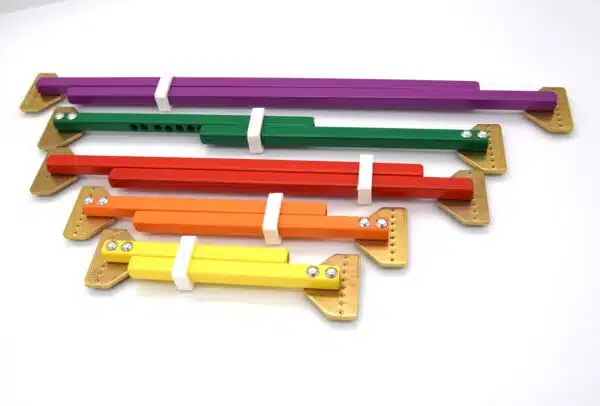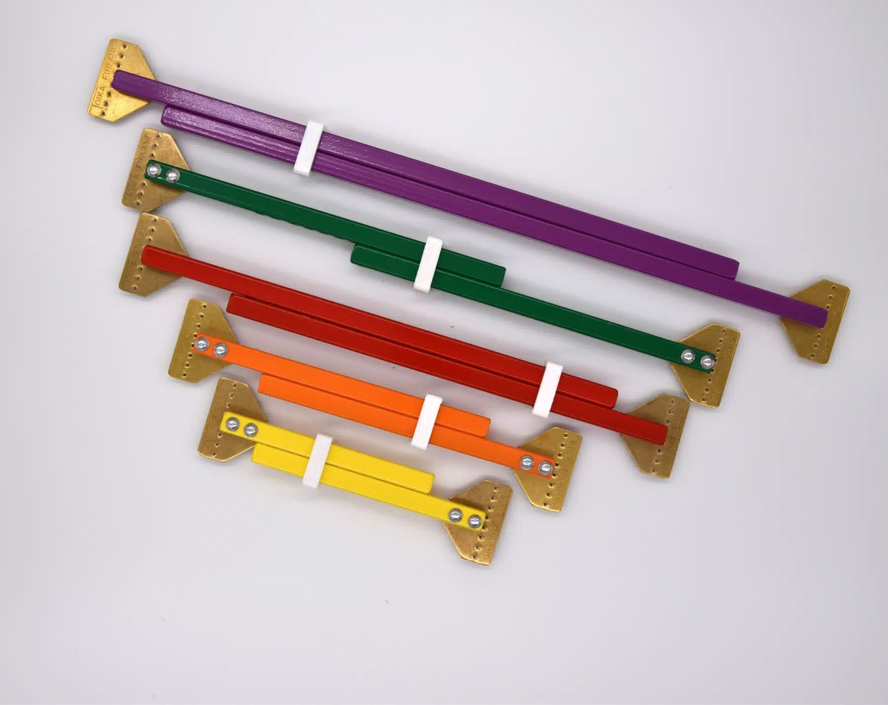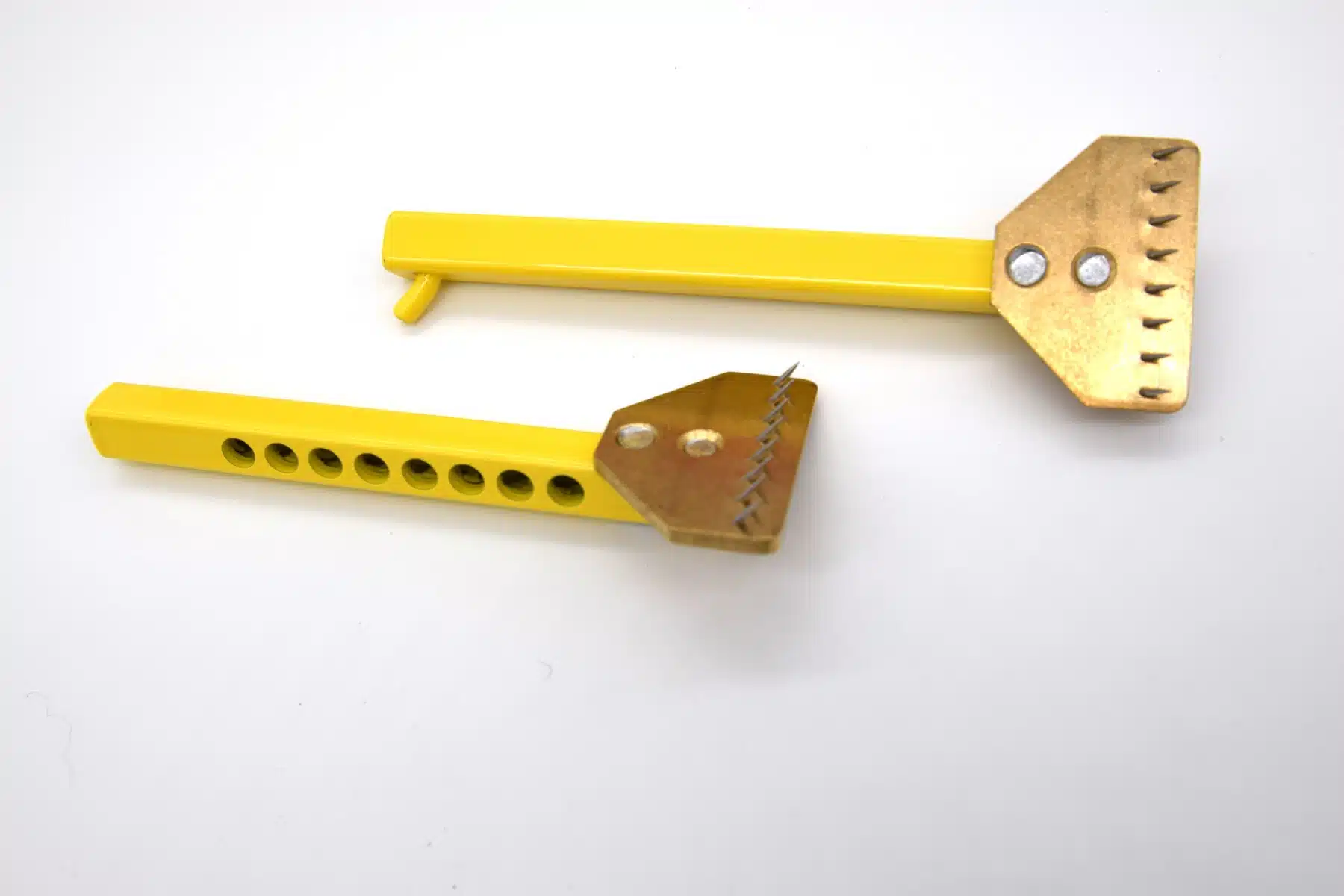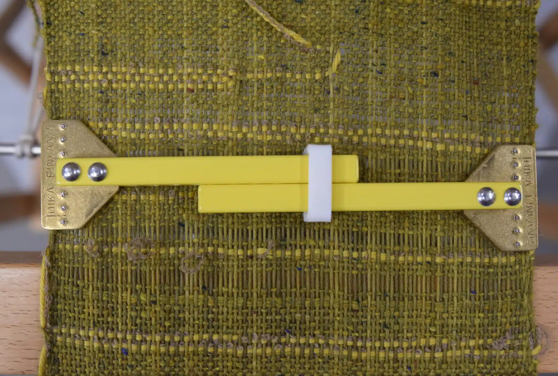 Deze breedtehouder stel je in op de gewenste afgewerkte breedte van je weefsel en pin je erop vast met de scherpe pinnetjes aan de uiteinden. Zo kan je regelmatig controleren of je weefsel dezelfde breedte aanhoudt door hem regelmatig op een nieuw stukje geweven stof te zetten. ze zijn verkrijgbaar in breedtes van 15-20 cm, 20-27 cm, 25-32 cm, 30-43 cm en 40-60 cm.