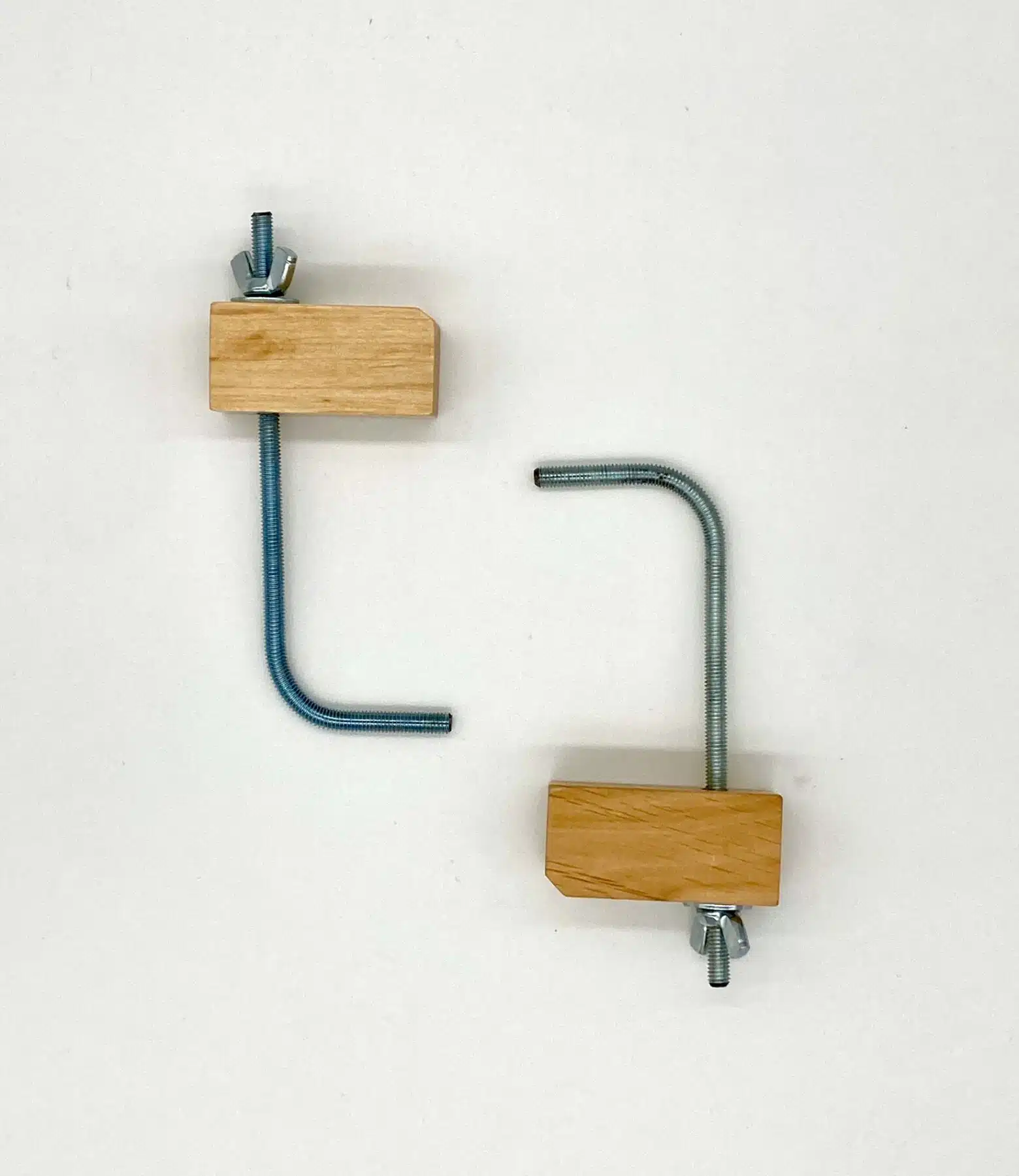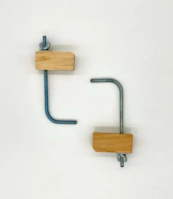 Elke klemmenset bestaat uit 2 houten blokjes en 2 gebogen draaistangen met vleugelmoeren om je hevelrietgetouw makkelijk aan een tafelblad te kunnen bevestigen.