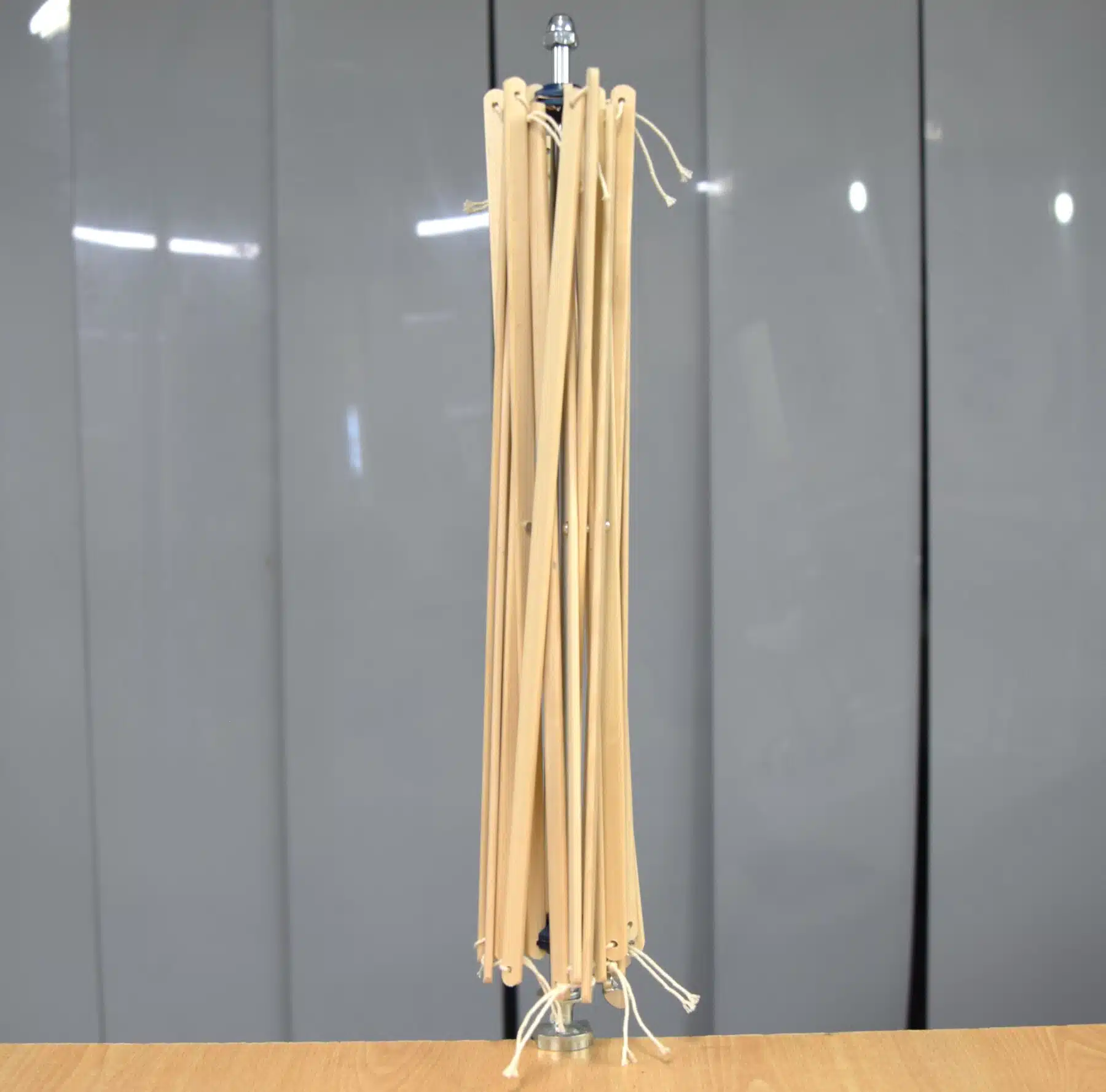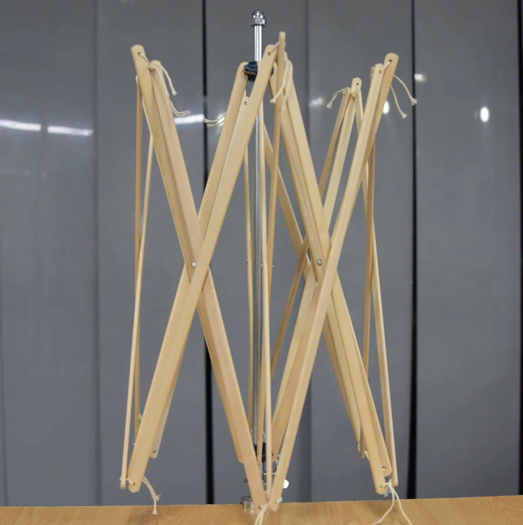 De uitklapbare overwindmolen met stalen frame en houten lamelle kan je traploos verkleinen tot 30 cm of vergroten tot 220 cm