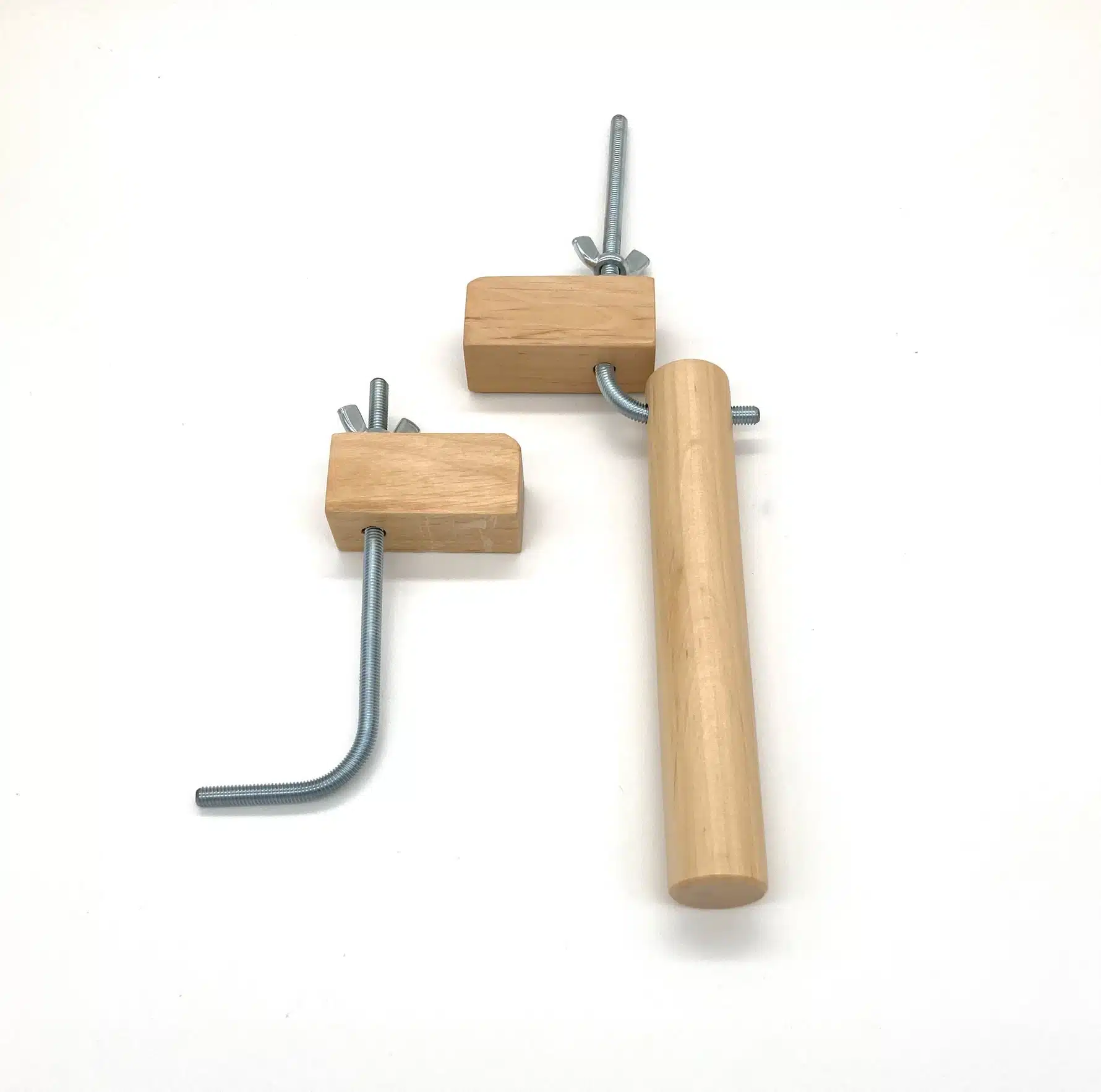 Je zet het hevelrietgetouw vast met de houten klem en zet het houten paaltje op een afstand van de voorziene lengte van je schering.